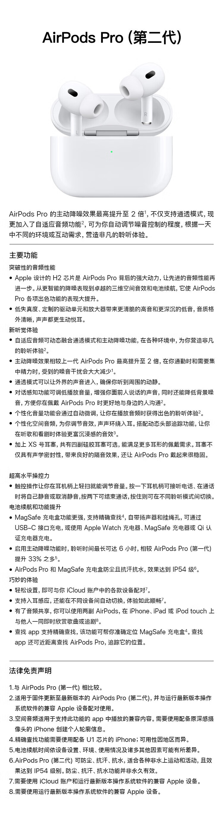 商品名称:Apple苹果 AirPods Pro (第二代) MagSafe充电盒 (USB-C) 无线蓝牙耳机 适用iPhone/iPad/Apple